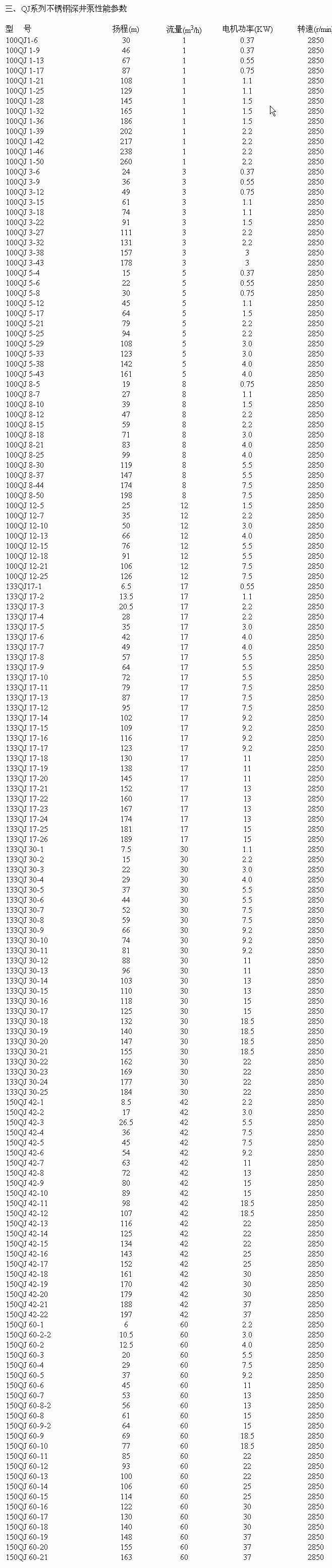 不锈钢系列深井泵是引进国外泵业公司领先的制泵技术生产的高性能耐磨型电泵,动力部份配用目前国际先进技术生产的水浸式不锈钢潜水电机,对水质绝对无污染,是当前国内外深井泵之精品。选用优质不锈钢外壳、轴芯、联轴器、入水座和泵头(或铜合金入水座、泵头),高强度抗耐磨新型复合高分子材料叶轮和不锈钢导流壳,全新“浮动式”结构叶轮在工作期间对电机无轴向压力。特别适用于工矿业、农业、建筑业、养殖业、食品饮料业及家庭式(或高层送水使用)。